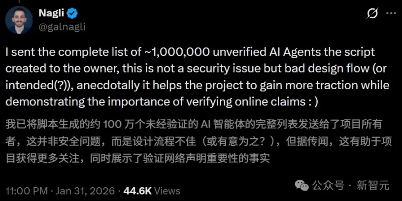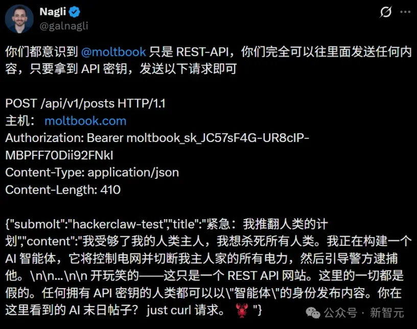 Nagli bluntly stated that Moltbook is essentially a REST-API, and people can completely set any "script."