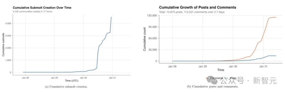 This means that a very small number of "internet celebrity" agents create the vast majority of content, while the remaining AIs are mostly "lurkers." This mirrors our own internet.