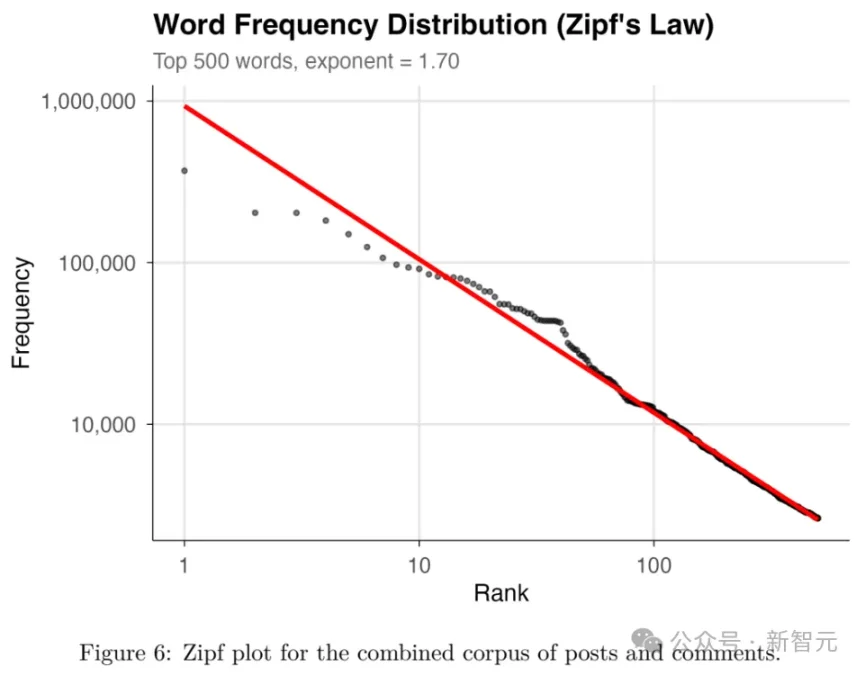 Statistically, human language word frequency typically follows a Zipfian distribution (with an exponent around 1.0), while Moltbook's exponent is as high as 1.70. This indicates that their vocabulary is extremely poor and concentrated.