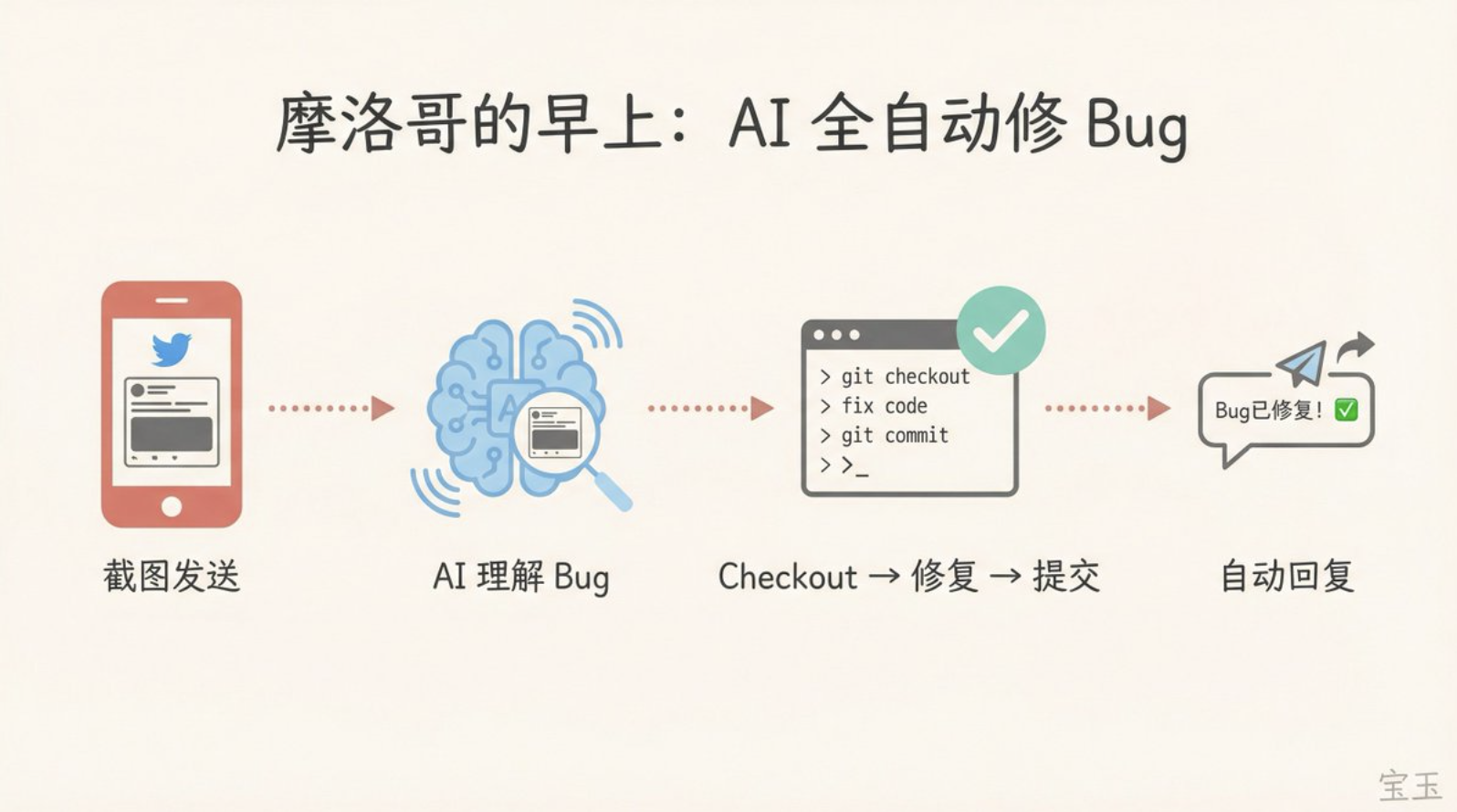 The AI understood the content of the tweet and recognized it as a bug report. It checked out the corresponding Git repository, fixed the issue, submitted the code, and then replied to that person on Twitter saying it was fixed.