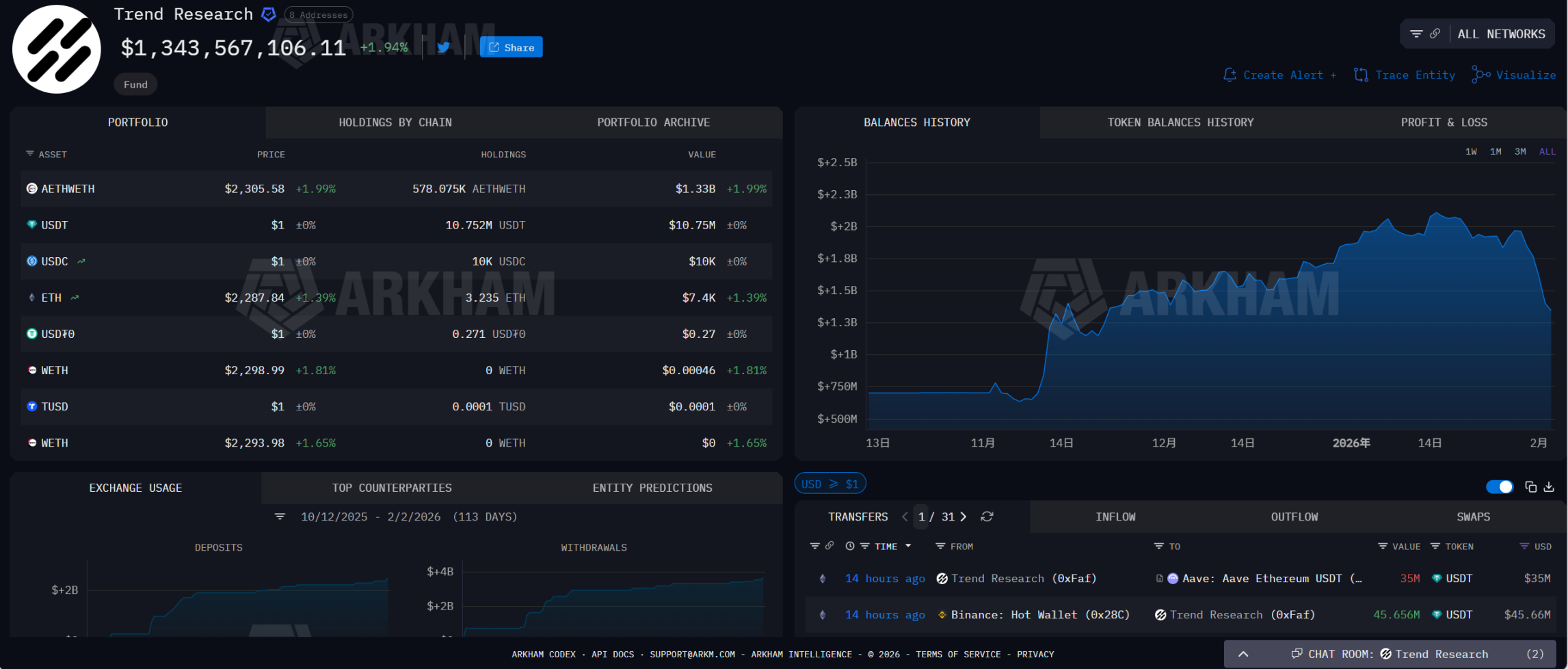 As of February 2, Trend Research has deposited a total of 73,588 ETH (worth about $169 million) into Binance in multiple transactions for sale and loan repayment, with total losses in the ETH lending position reaching $613 million, including realized losses of $47.42 million and unrealized losses of $565 million, currently still bearing a stablecoin leveraged loan of about $897 million.