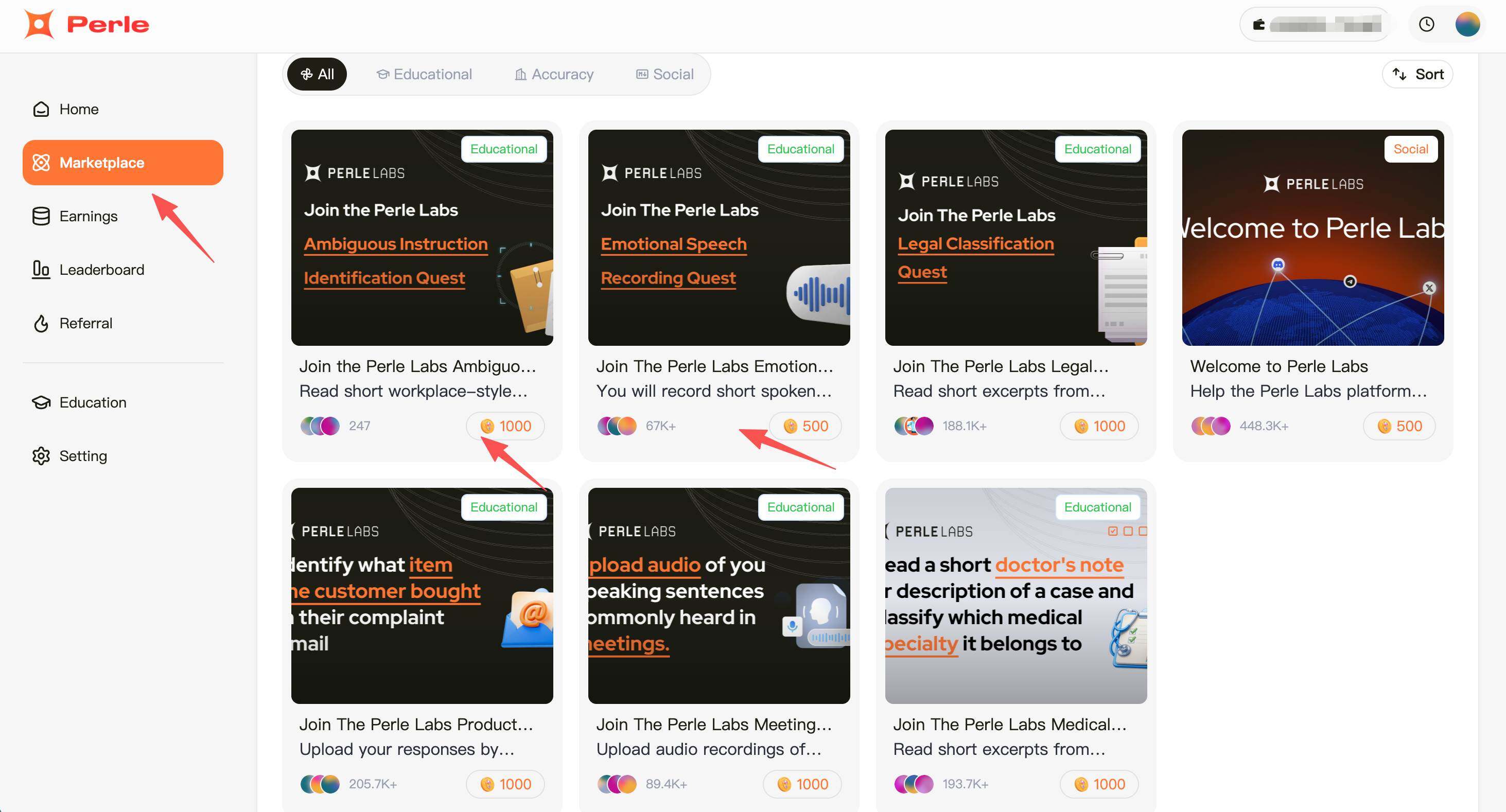 STEP 2. Click "Marketplace," where two tasks have been updated: Join The Perle Labs Emotional Speech Recording Quest: read specified content (in English) with specific emotions, totaling 5 questions, each worth 100 points, for a total of 500 points; Join the Perle Labs Ambiguous Instruction Identification Quest: identify vague statements in paragraphs, totaling 10 questions, each worth 100 points, for a total of 1000 points.