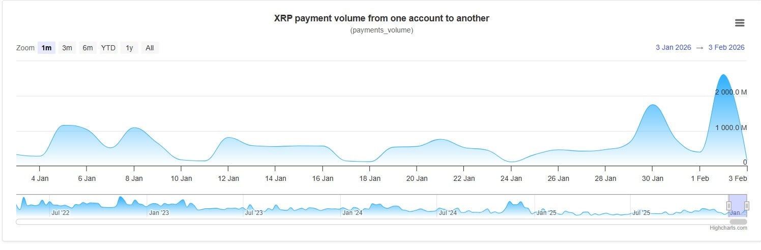 On the other hand, on-chain activity on the XRP Ledger might indicate that the worst selling pressure phase is already over, even though the price structure still seems brittle. The significant increase in payments volume seen on the XRP Ledger at the end of January, which was followed by a sharp decline in transaction flows soon after, is the primary cause of this interpretation.