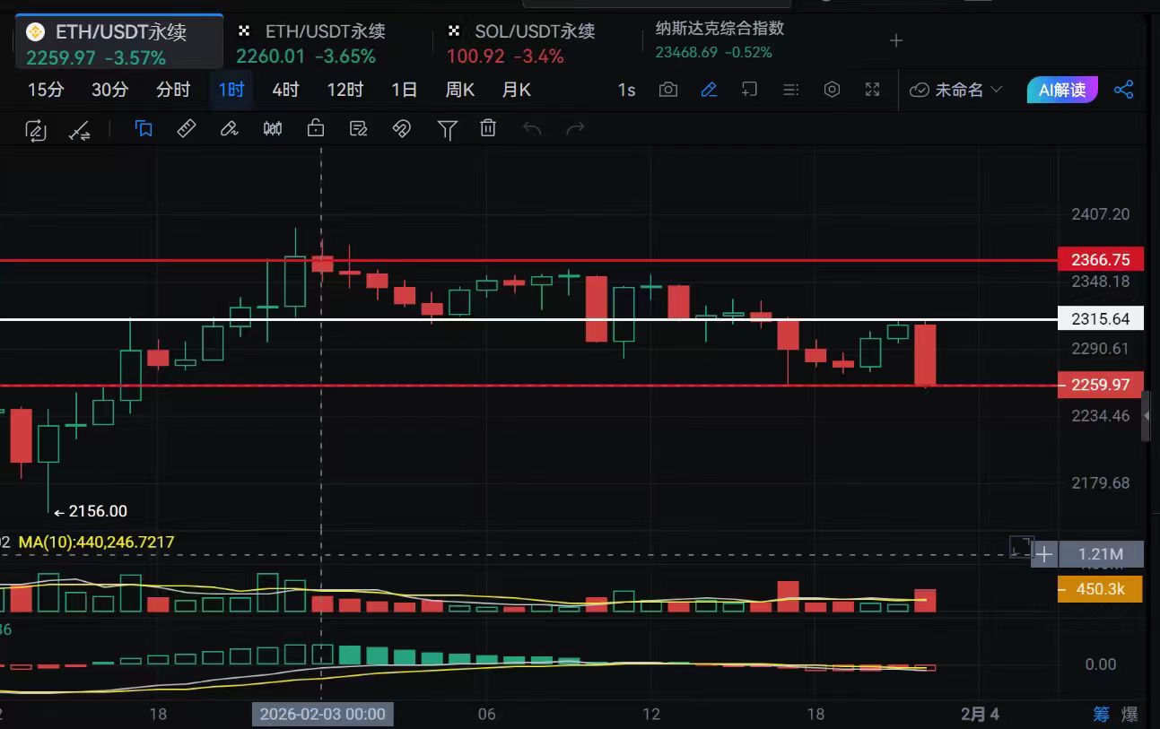Ethereum's performance on February 2nd saw a rise to around 2366 at 10:30 PM, which faced resistance. After a pullback to 2320, it pushed up to around 2395, then fell back to 2320 for a second rebound, and then it moved down to the lowest point around 2260, which is better than the 2250 I provided.