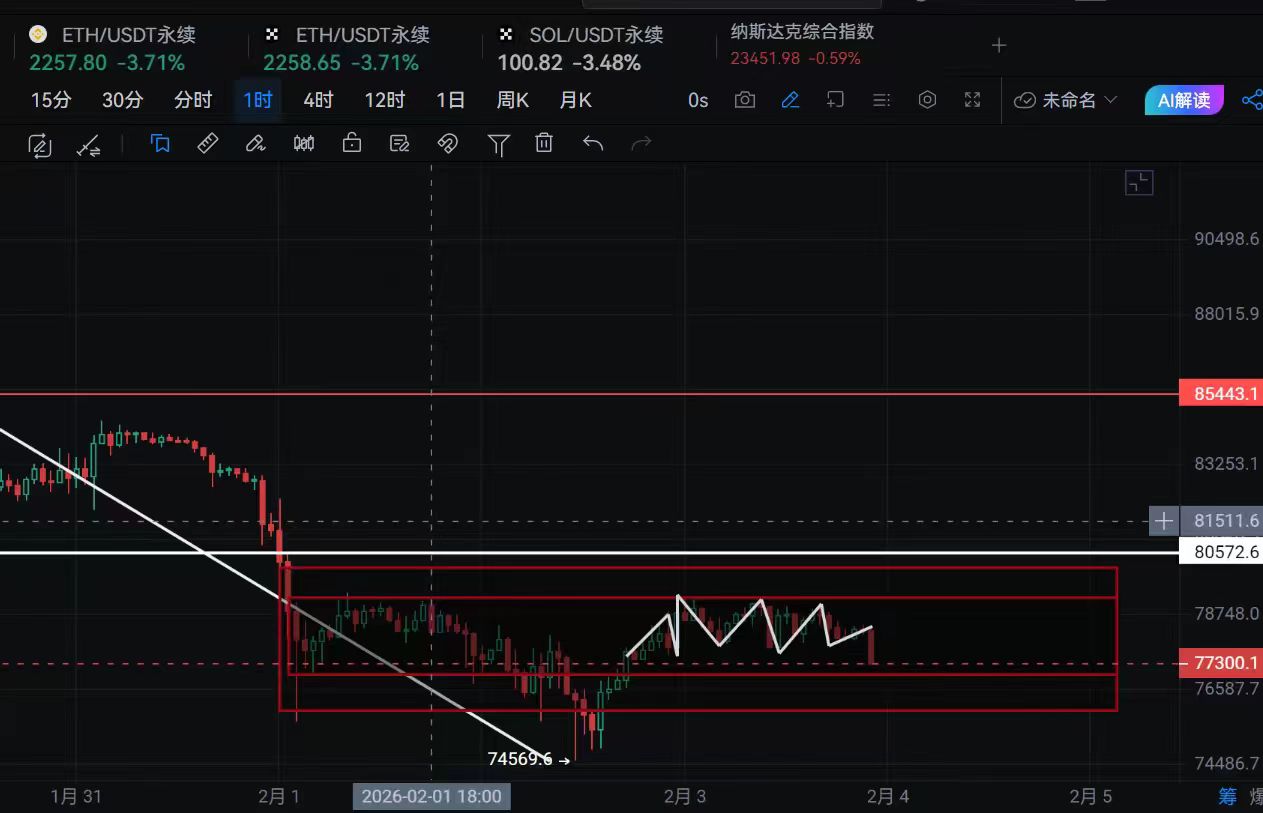 Let's briefly review the situation on February 2nd. After Bitcoin fluctuated around 78800, there were signs of selling, and after dipping to around 77500, there were signs of support. Throughout the night session until now, it has fluctuated back and forth five times. The main range of consolidation is also around 77500-78800. It is running on reduced volume, and each time it tests upwards, there is selling pressure pushing it back down. Whether this is digesting divergences or selling pressure release needs further observation.