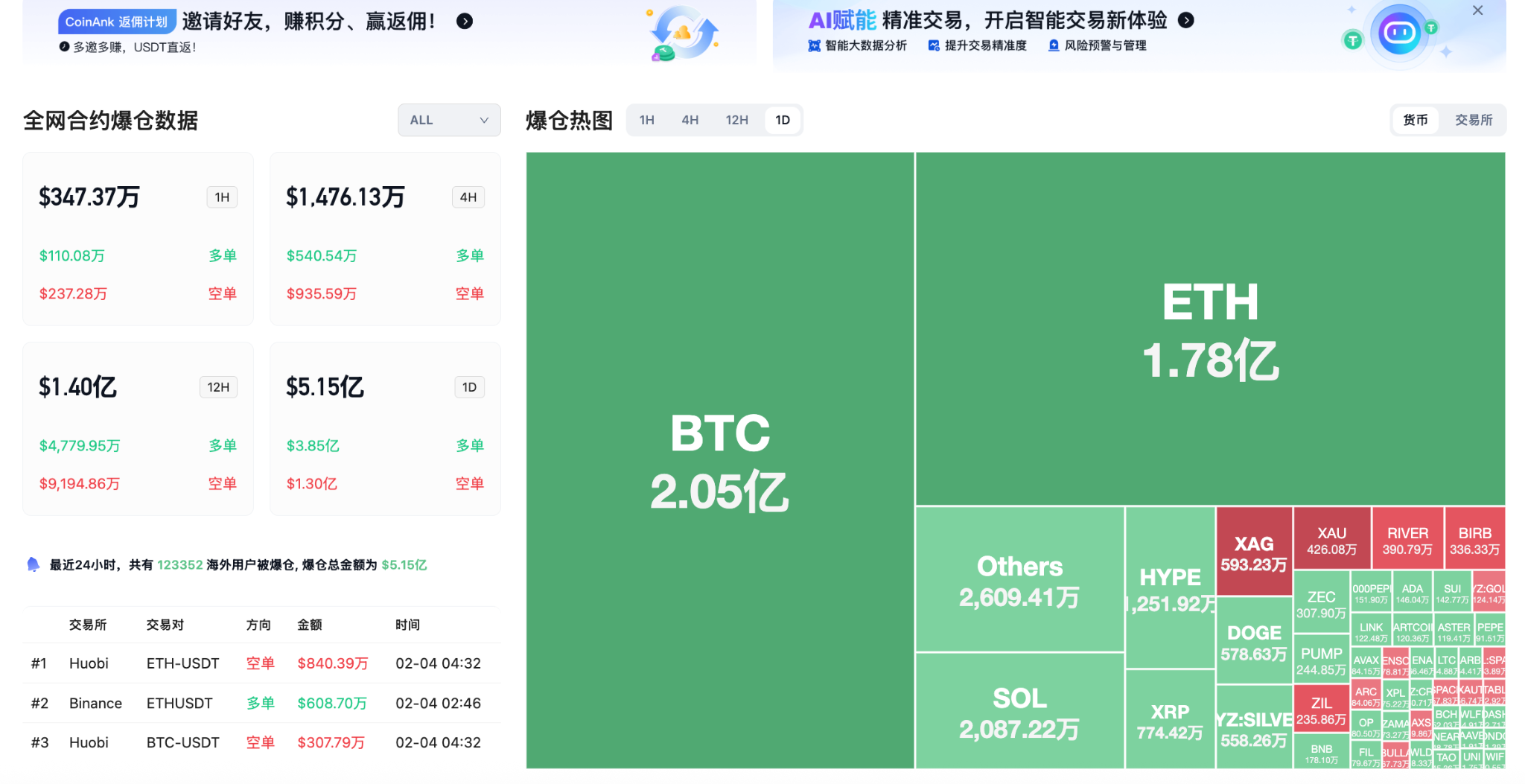 24-hour liquidation data: A total of 123,352 people were liquidated globally, with a total liquidation amount of $515 million, including $205 million in BTC, $178 million in ETH, and $20.87 million in SOL.