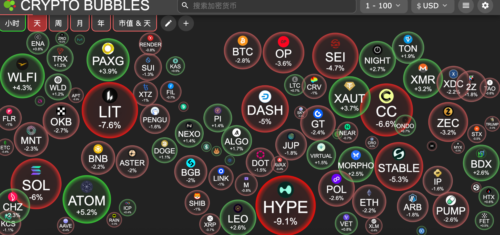 Today's top gainers among the top 100 cryptocurrencies by market capitalization: Cosmos up 5.2%, World Liberty Financial up 4.3%, PAX Gold up 3.9%, Tether Gold up 3.7%, Monero up 3.2%.