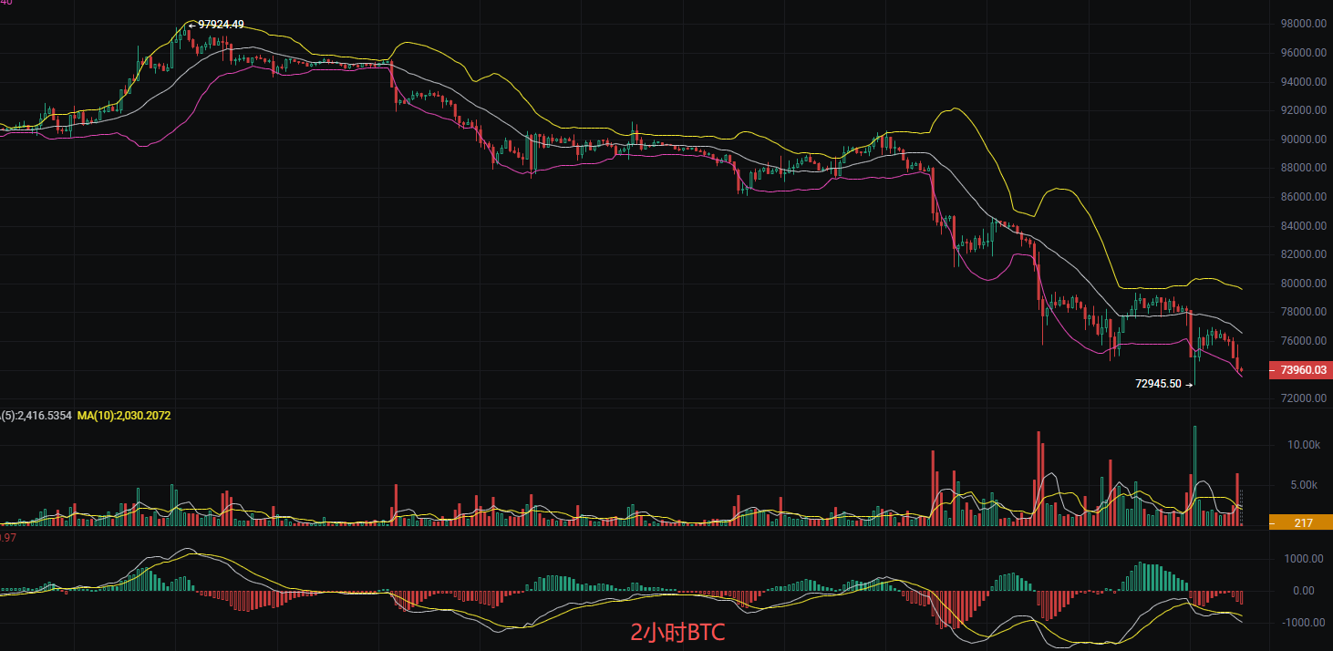 The current price of Bitcoin is 73900. Liying's short-term operations continue, with a situation of double gains. Currently, the daily chart shows a significant decline over the past two days, forming a long bearish candle. The current closing price of 74130 is close to the previous low area of 73795. The 2-hour candlestick chart shows a trend of oscillating downward, with multiple failed attempts to rebound and gradually lowering highs. The MACD on the 2-hour chart shows strong bearish momentum, but there are signs of weakening in the short term. The RSI is in the oversold range, indicating a technical rebound demand, while the EMA shows a bearish trend in the short and medium term, with a long-term trend still downward. Liying's strategy remains focused on high-level bearish positions, with some support for bullish positions.