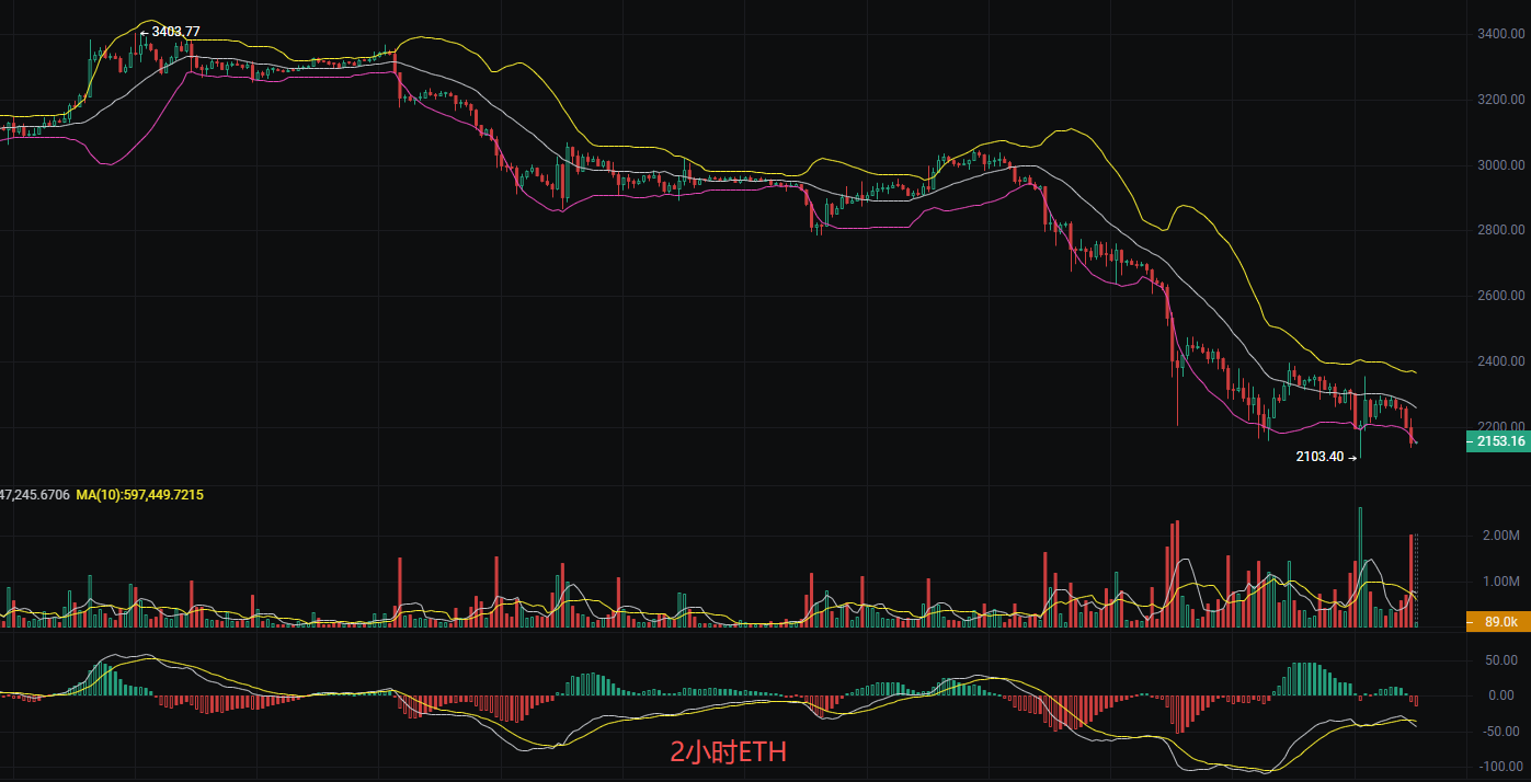 Before publication, the current price of Ethereum is 2150. Is yesterday's situation a case of eating from both ends? Such a good market still allows for finding positions for short-term bullish trades after breaking the previous low. The daily chart continues to decline, forming multiple large bearish candles with strong bearish momentum. The 2-hour chart shows a rapid drop from a high position, currently in a low-level oscillation and consolidation phase, with some signs of a rebound in the short term, but overall still leaning towards weakness. The MACD on the 2-hour chart remains bearish. The RSI in the oversold range indicates a technical rebound demand, but it has not yet entered a clear bullish trend. The EMA shows a bearish arrangement, and Liying advises everyone to choose entry points cautiously.