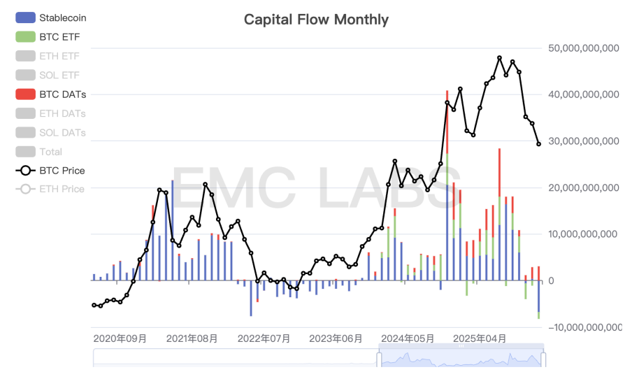 In November, the outflow was primarily from BTC ETF channels, with only a small amount of stablecoins flowing out; during the December rebound, there was a slight inflow of stablecoins, while BTC ETF channels continued to see outflows. This month, stablecoins experienced a significant outflow of up to $6.768 billion, marking the second-largest outflow month of this cycle, only behind the $7.648 billion outflow in May 2025. Additionally, the funds from BTC ETF channels, which have been the most important driving force in this cycle, have seen outflows for three consecutive months, setting a record for the longest outflow in this cycle.