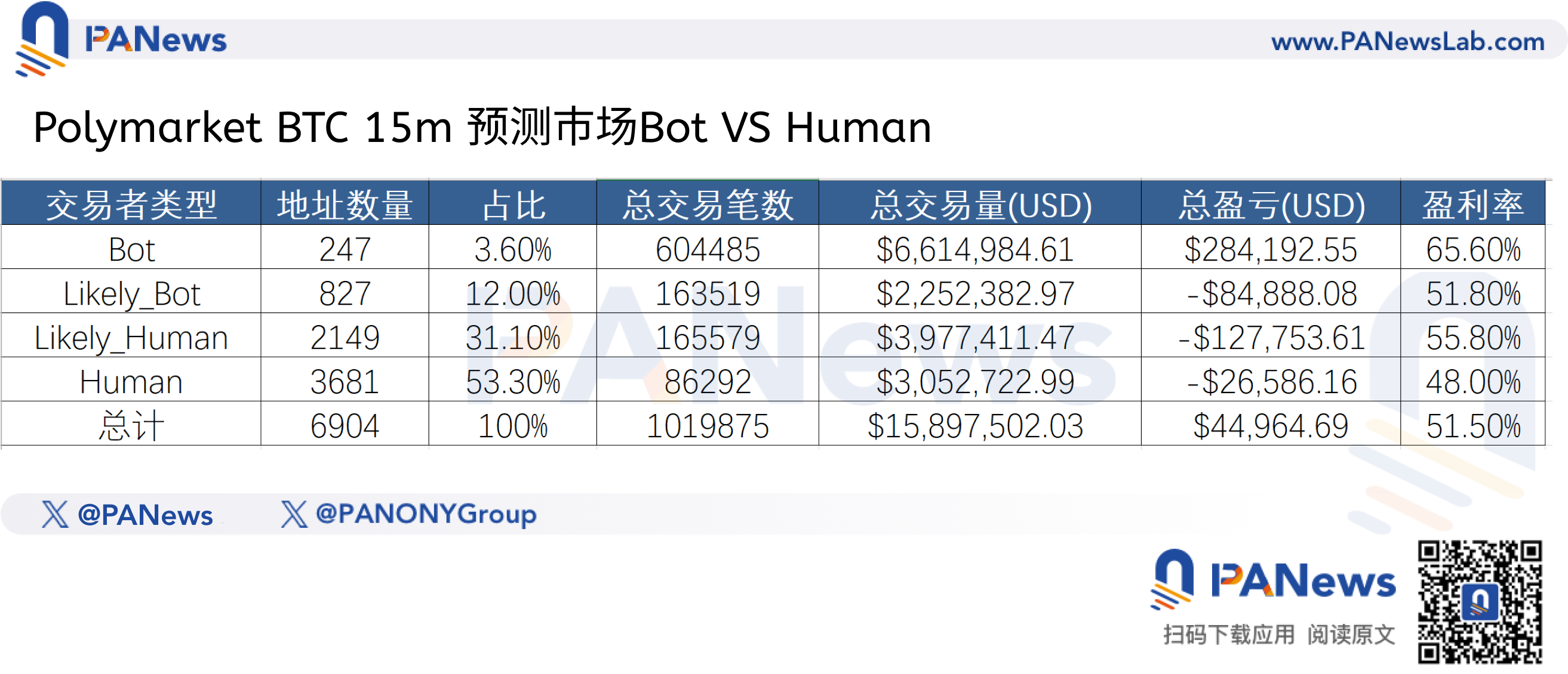 Recently, the PANews analysis team conducted a comprehensive data review of the recent Bitcoin 15-minute rise and fall prediction market. In a vast database covering about 3 days, 291 short-term markets, and a total of 1.05 million transactions, we see not just cold numbers, but a naked game of algorithms versus human nature.