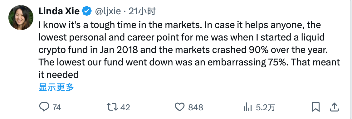 I know the current market environment is tough. I hope these experiences can help some people. For me, the lowest point personally and professionally was when I launched a crypto liquidity fund in January 2018, and the market fell 90% that year. Our fund had a maximum drawdown of a shameful 75%, meaning it needed to rise 4 times to break even.