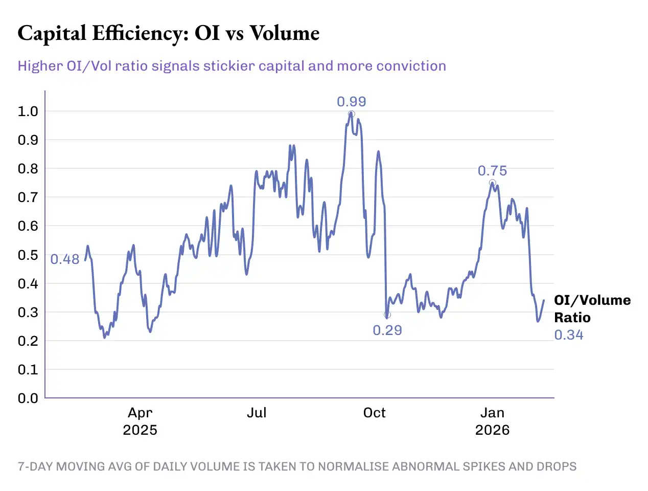 A clearer victory lies in the growth of the OI/volume ratio. This is a direct signal that there is "patient capital" willing to trust and bet on the various products and markets emerging on perpetual trading platforms.