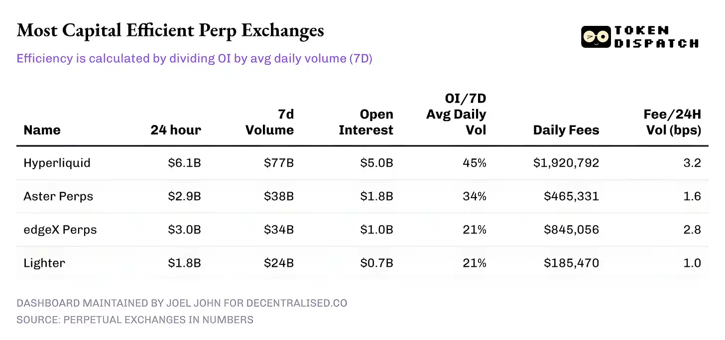 · edgeX and Lighter: Both perform similarly on the capital efficiency ladder, each with an OI/Vol of 21%. However, edgeX's monetization in terms of fees is comparable to Hyperliquid at 2.8 bps.