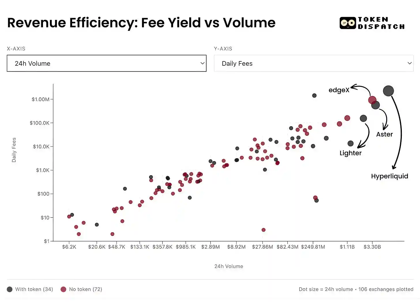 · Hyperliquid’s fee income reinforces this narrative. Its take rate is approximately 3.2 basis points, effectively converting the largest share of 24-hour trading volume into fee income.