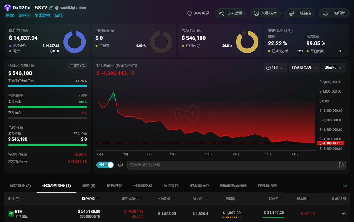 Brother Majie has accumulated a net loss of over $27 million on Hyperliquid, experiencing over 250 liquidations since October last year, with the current account balance only at $20,000.
