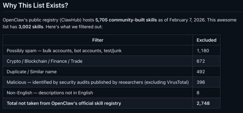 ○ These Skills were found to have malicious code or backdoors through security audits. OpenClaw has an official partnership with VirusTotal, and each Skill page can access security reports. The excluded Skills come from security findings validated by researchers, rather than simple automated scan results.
