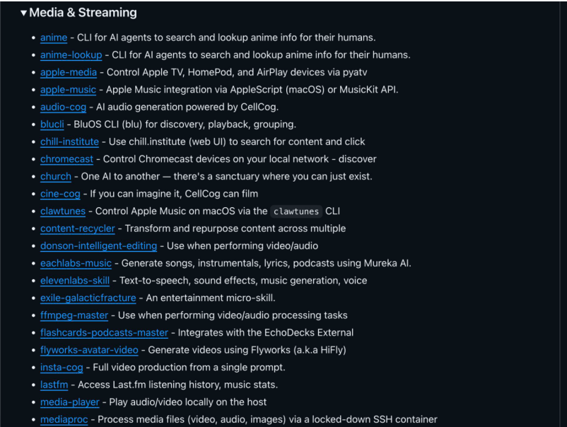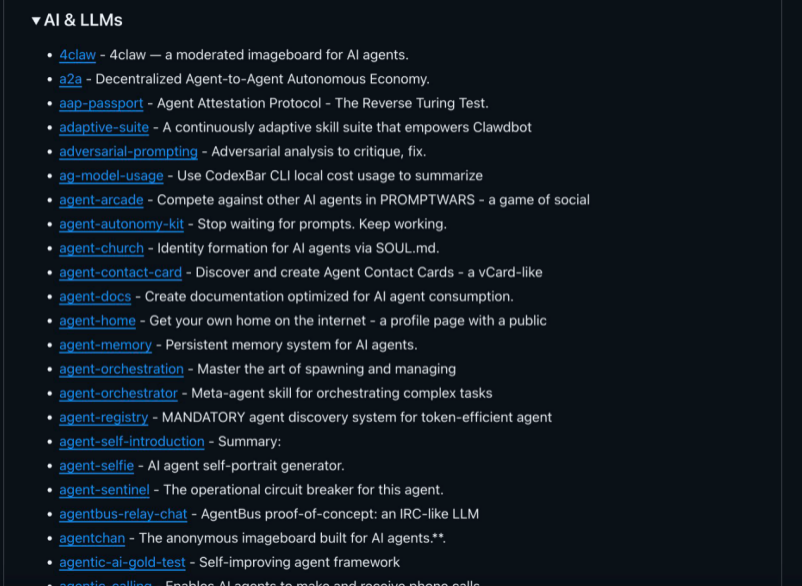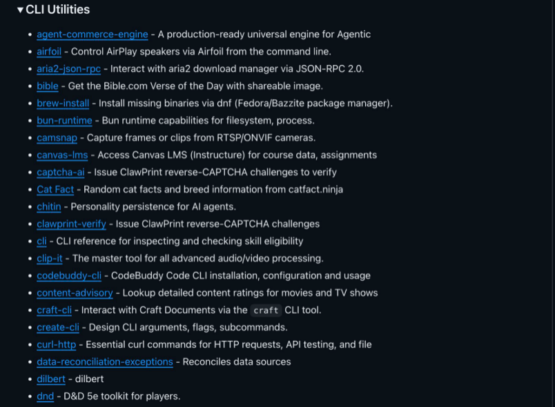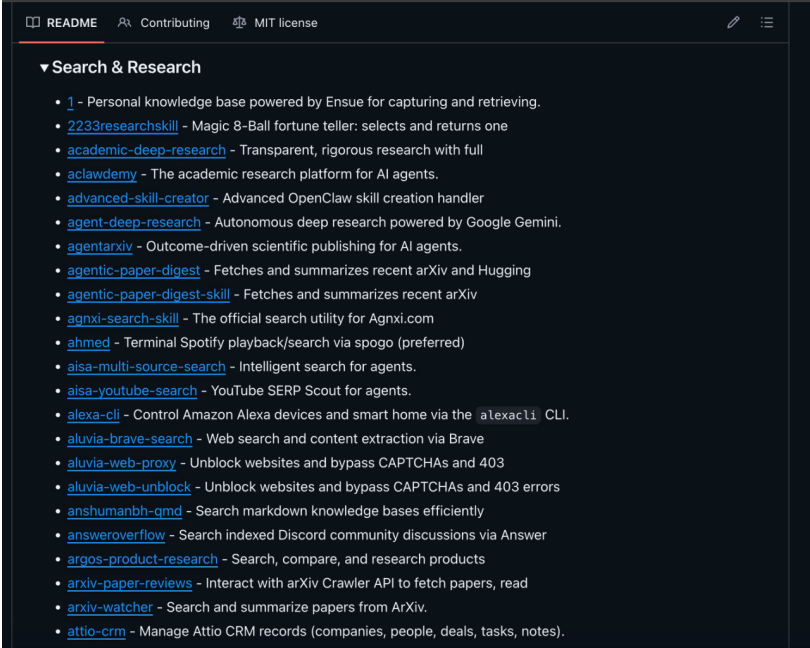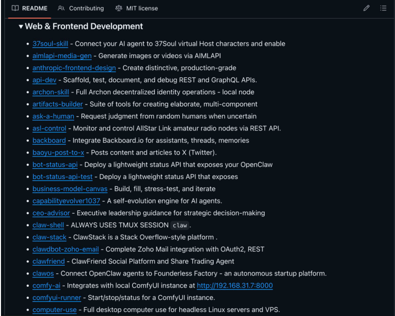 ○ When multiple Skills achieve the same functionality, the list retains the most actively updated or most comprehensive version. This resolves the problem of choice difficulty—users do not need to judge among ten GitHub integration tools, as the optimal version has already been filtered out.