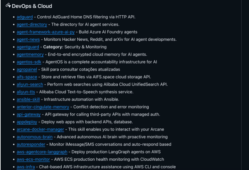 The scale of the DevOps & Cloud category is second only to AI & LLMs, with over 60 Skills related to AWS, over 25 for Azure, and 6 specialized skill sets for Kubernetes. This reflects the complexity of cloud-native architectures— even with AI Agents, managing modern cloud infrastructure still requires a significant number of specialized tools.