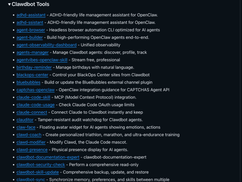 In the Security & Passwords category, flaw0 is the "security and vulnerability scanner for OpenClaw code, plugins, Skills," openguardrails detects and prevents prompt injection attacks hidden in lengthy texts, clawsec-suite allows users or Agents to browse or set ClawSec, secure-install scans ClawHub Skills through the ClawDex API. The existence of these tools indicates that the community is aware of the security risks in the AI Agent ecosystem and is proactively building defense mechanisms.