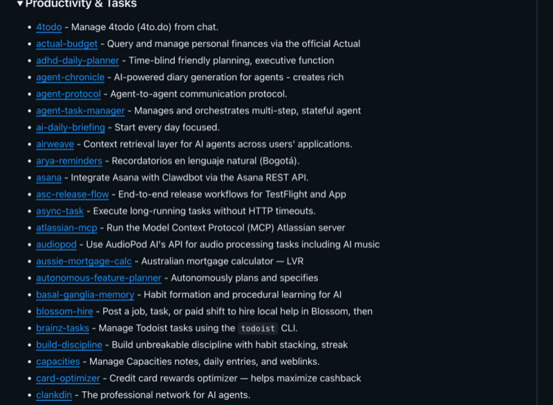 In the Productivity & Tasks category, clawlist is described as "a must-have tool for multi-step projects/long-running tasks/unlimited loops," idea-coach offers "AI-driven management of ideas/problems/challenges," and deepwork-tracker tracks deep work sessions. These tools are not just task managers but aim to understand and optimize the workflow itself.