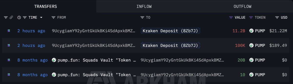 A wallet(9Ucygi) linked to the http://Pump.fun team deposited 11.2B $PUMP ($21.22M) to #Kraken 2 hours ago, likely to distribute locked tokens.