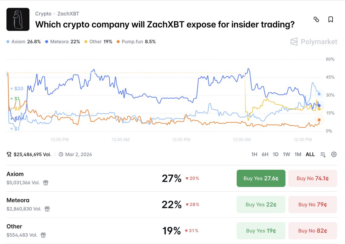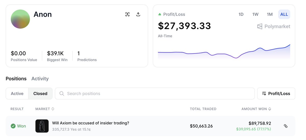 An anon trader used a new wallet to bet $50.7K that Axiom would be accused of insider trading by @zachxbt, when the odds were only 15.1%.