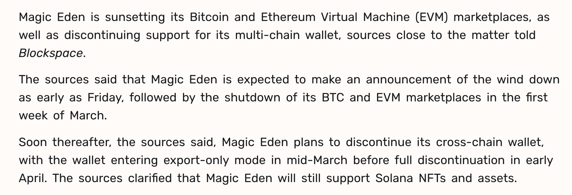 Yesterday, according to Blockspace citing informed sources, Magic Eden is expected to close its Bitcoin and Ethereum EVM trading platforms in the first week of March, after which the multichain wallet will enter export mode only (allowing users to withdraw assets) in mid-March and will completely cease operations in early April. Related official announcements may be released as early as this Friday. However, it is noteworthy that the platform will still support Solana NFTs and assets.