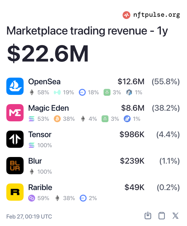 A deeper issue lies in the sustainability of Magic Eden's original business model. Magic Eden relied on transaction fees for revenue, but with the dramatic decline in NFT trading volume, this income source has shrunk severely. According to nftpulse data, as of the time of writing, in the past year, Magic Eden's annual trading volume was approximately $503 million, while the annual market trading income was only $8.6 million. Although the company attempts to attract investors through staking rewards with the ME token (such as USDC stablecoin dividends), during the winter of a bear market, maintaining the token economic system is challenging.