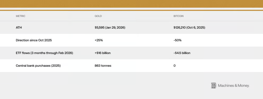 The massive discrepancy in capital flows is the strongest rebuttal to the "digital gold" thesis: when large institutions and sovereign funds genuinely needed a hedge against the macro environment that Bitcoin should have been able to protect them from, they chose gold at over three to one in terms of fund allocation.