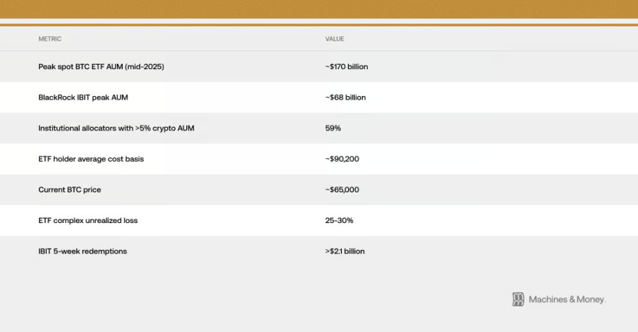 This creates a self-reinforcing cycle: because institutions categorize it as a tech stock, its capital flows coincide with those of tech stocks; this synchrony, in turn, reinforces the institutional perception of it as a tech stock. Estimates suggest that the average acquisition cost for holders of US spot Bitcoin ETFs is around $90,000, meaning that with the current price near $64,000, the entire ETF's institutional funds are now showing a loss of 25% to 30%. This cost gap is crucial as it transforms what might have been long-term holding institutional capital into persistent selling pressure. Those who thought buying ETFs would diversify risk or provide a hedge now watch as gold ETFs rise while their own holdings continue to lose value. Since early 2026, we’ve been able to observe the real-time chain reaction of ETF redemptions leading to Bitcoin price declines, with the duration of capital outflows setting a record since the ETF was launched. Just BlackRock's IBIT fund alone has seen over $2.1 billion in outflows in the past five weeks.