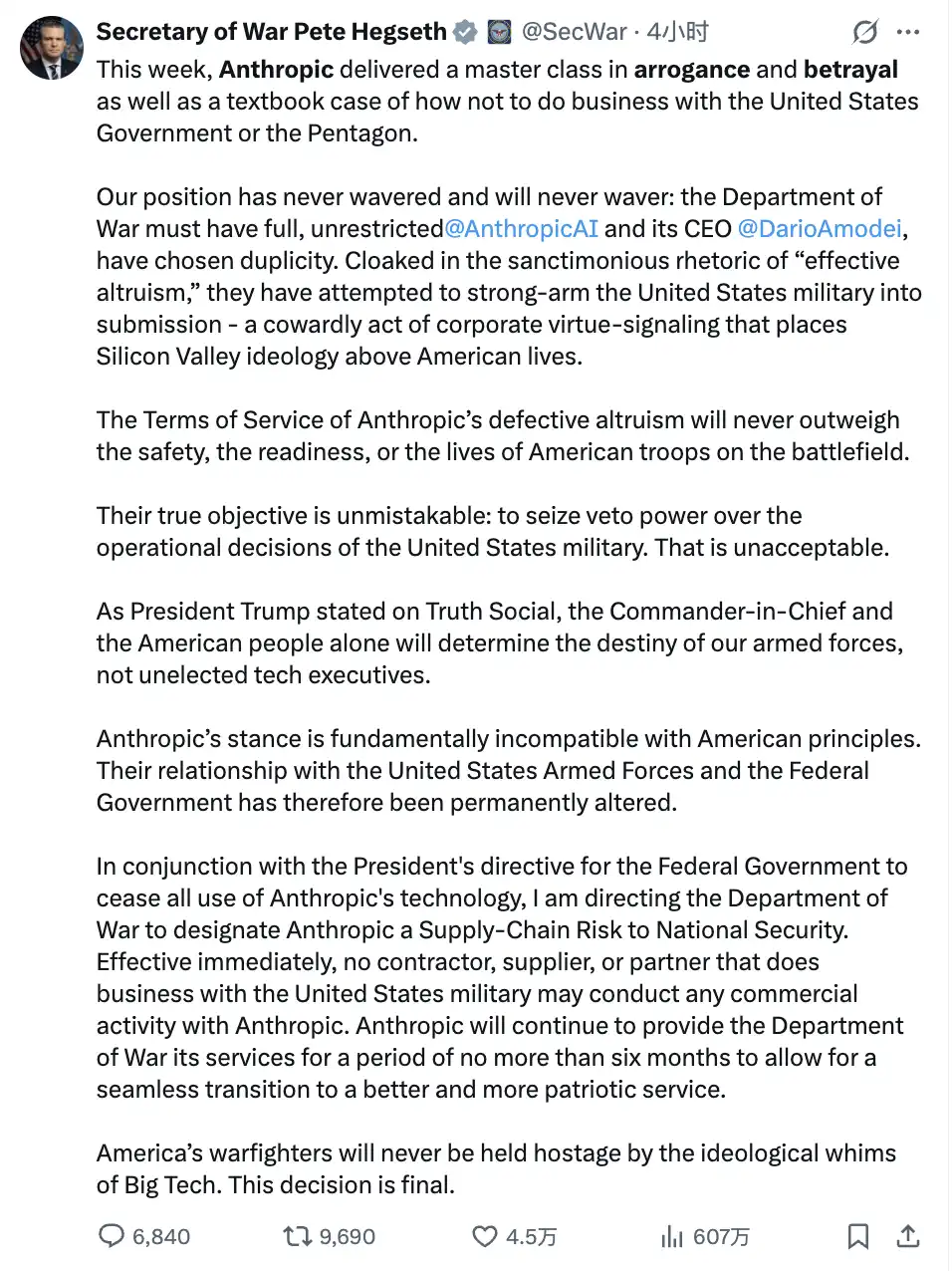 Defense Secretary Pete Hegseth issued an ultimatum to Anthropic’s CEO Dario Amodei: remove the usage restrictions in the contract and allow Claude to be used for all lawful purposes. Otherwise, the Pentagon would cancel the contract and classify Anthropic as a "supply chain risk." The deadline was set for the afternoon of February 27, local time.