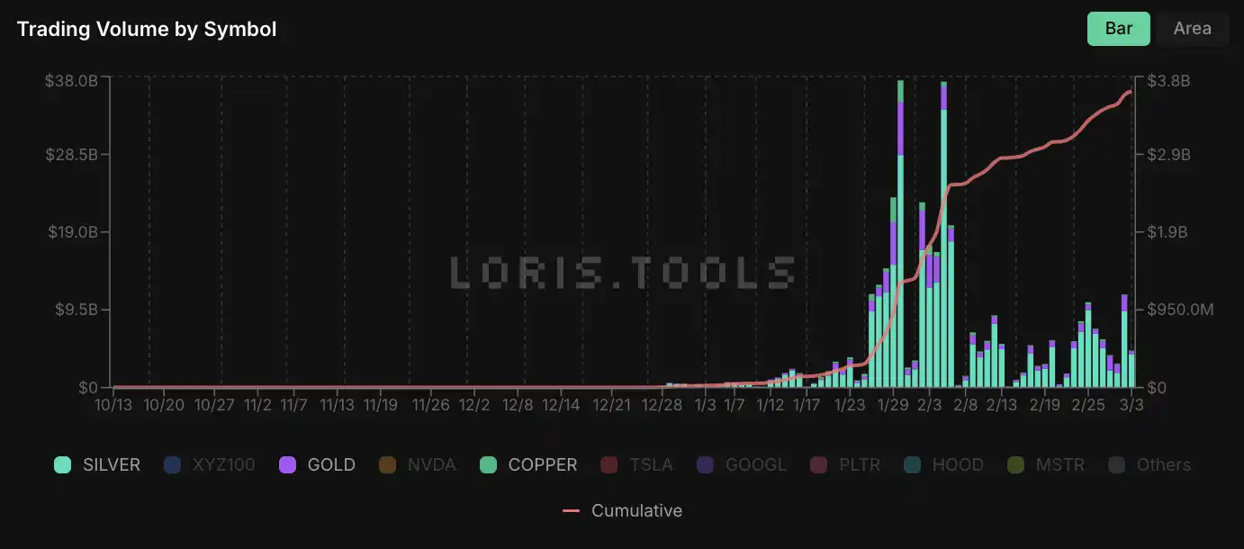 Trading volume of gold, silver, and copper contracts on Trade.xyz surged from January