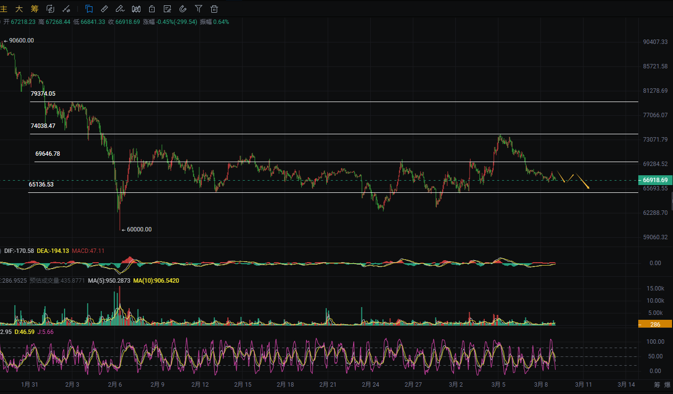 2. Long at 66500-67200, reserving space for supplementing near 65000, stop loss 800 points, target 68000-68800.