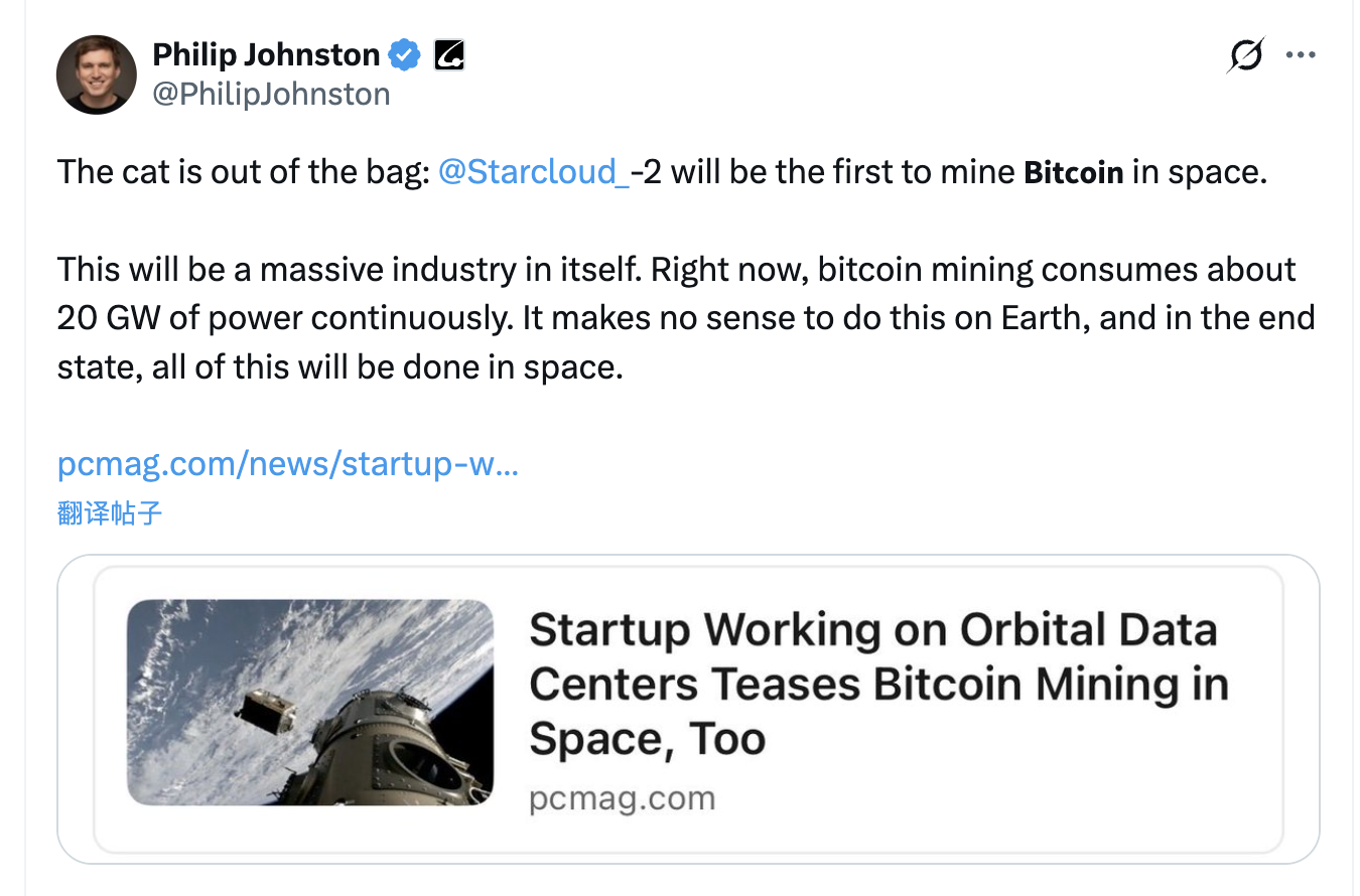 In a recent interview with HyperChange, Starcloud CEO Philip Johnston revealed that the company is currently focusing on its existing space computing power business, and it also has plans for Bitcoin mining. Starcloud will carry some ASIC hardware specifically designed for Bitcoin mining on the Starcloud-2 satellite to be launched later in 2026. If successful, Starcloud will become the world's first spacecraft to mine Bitcoin in space.