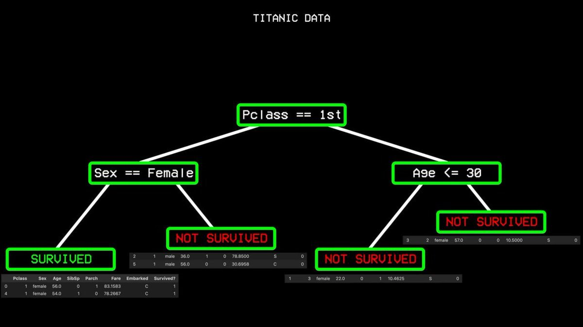 It starts from all the data and finds the single variable that best distinguishes between "survived" and "not survived." In the Titanic dataset, the answer is the cabin class. First-class passengers go one way, everyone else goes the other.