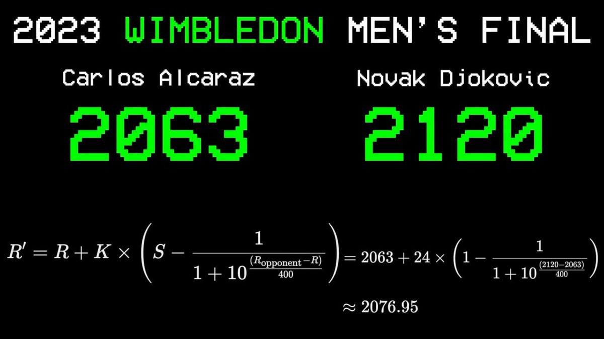 He demonstrated this formula using the 2023 Wimbledon final: Carlos Alcaraz (rating 2063) versus Novak Djokovic (rating 2120), Alcaraz came back to win.