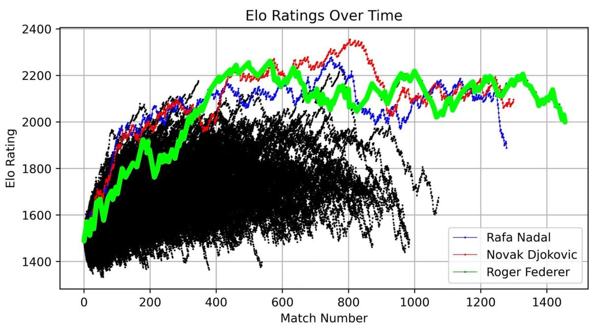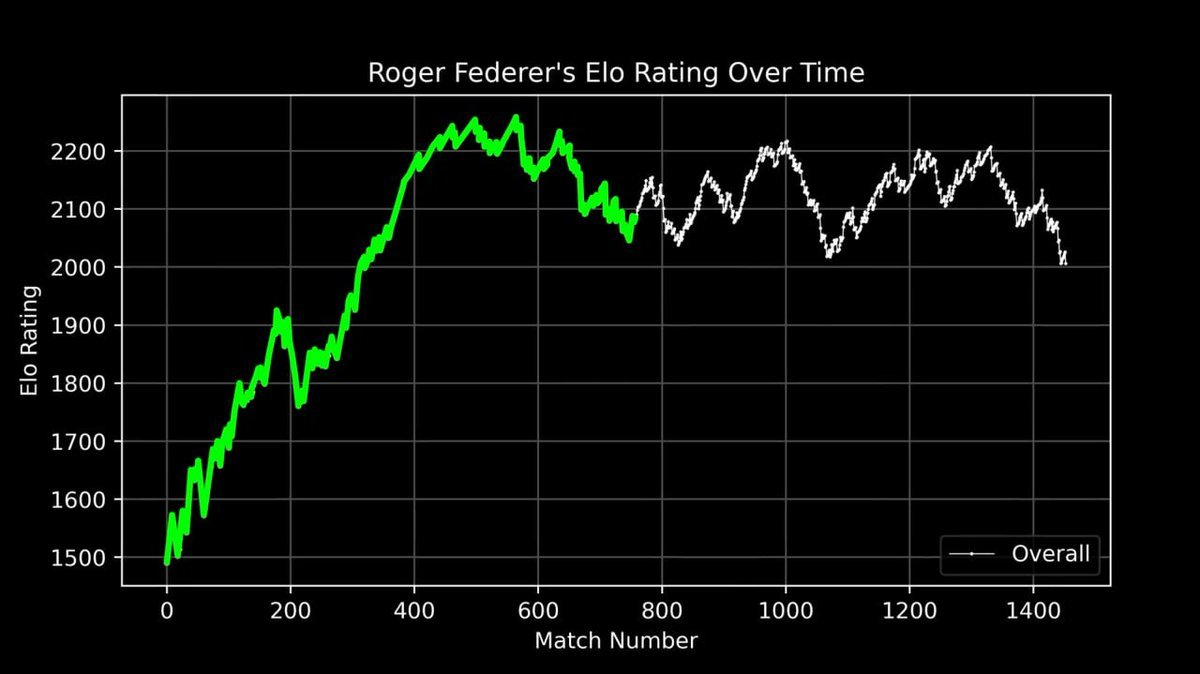 He plotted Roger Federer's entire career ELO score as a curve, recording every match from his debut to retirement.