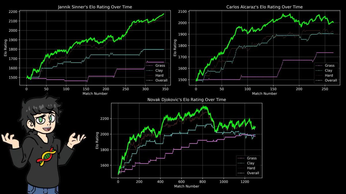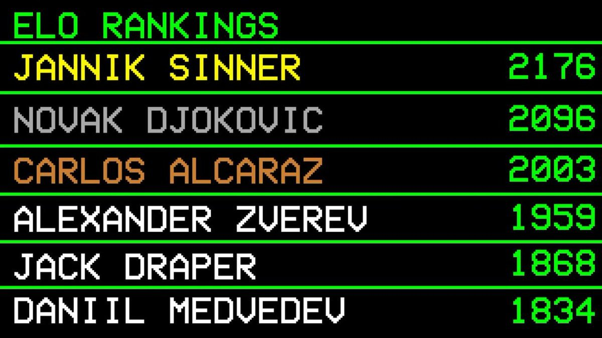 According to his custom ELO system, the current world number one is Jannik Sinner (2176 points), followed by Djokovic (2096 points) and Alcaraz (2003 points).