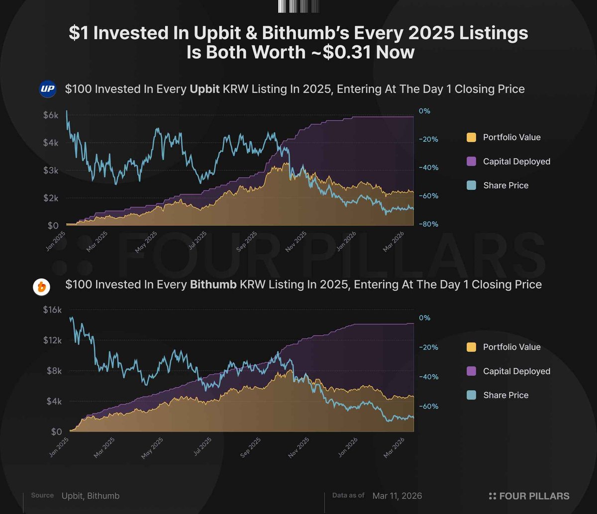 If $100 is invested in each of the 59 tokens newly listed on Upbit with KRW pairs in 2025, by March 11, 2026, the value of that portfolio would remain at only 31% of the original investment (i.e., each dollar drops to $0.31). Bithumb (with 144 tokens) has a similar performance, also at 31%; while Binance (with 92 tokens) is slightly lower at 29%. All three major exchanges led to a reduction of about 70% of assets.