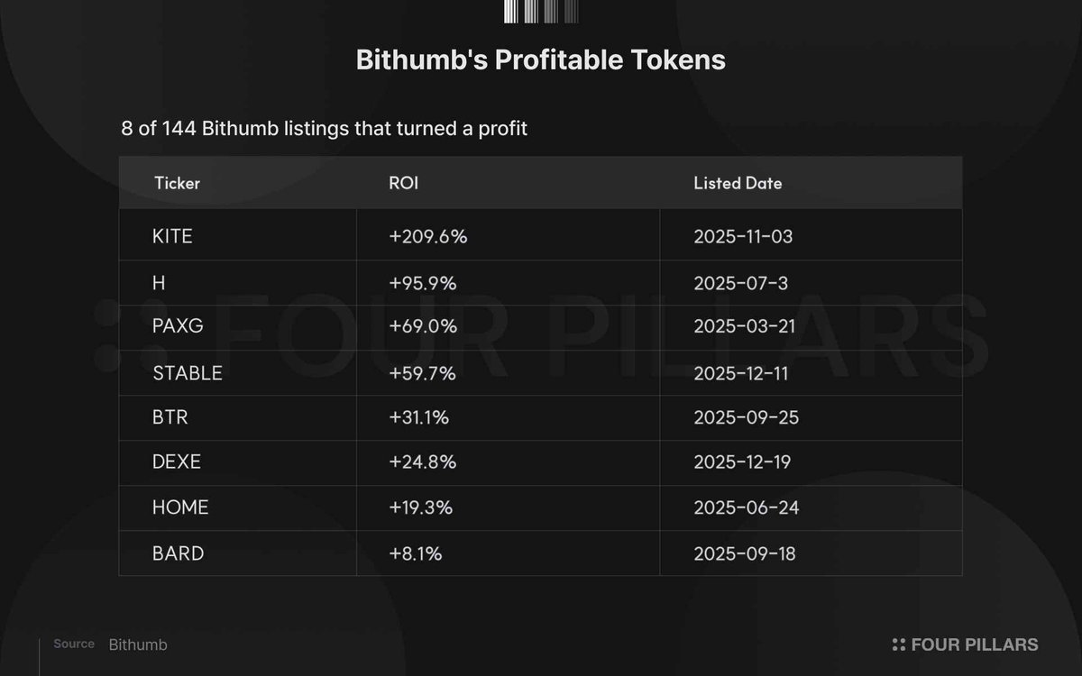 Both exchanges had over 40% of tokens concentrated in the loss interval of -75% to -90%. In Upbit, this range accounted for 46%, with an additional 9 tokens (15%) suffering extreme losses exceeding 90%. Only two tokens ultimately achieved positive returns: Kite (KITE, up 232.8%) and Lombard (BARD, up 9.3%).