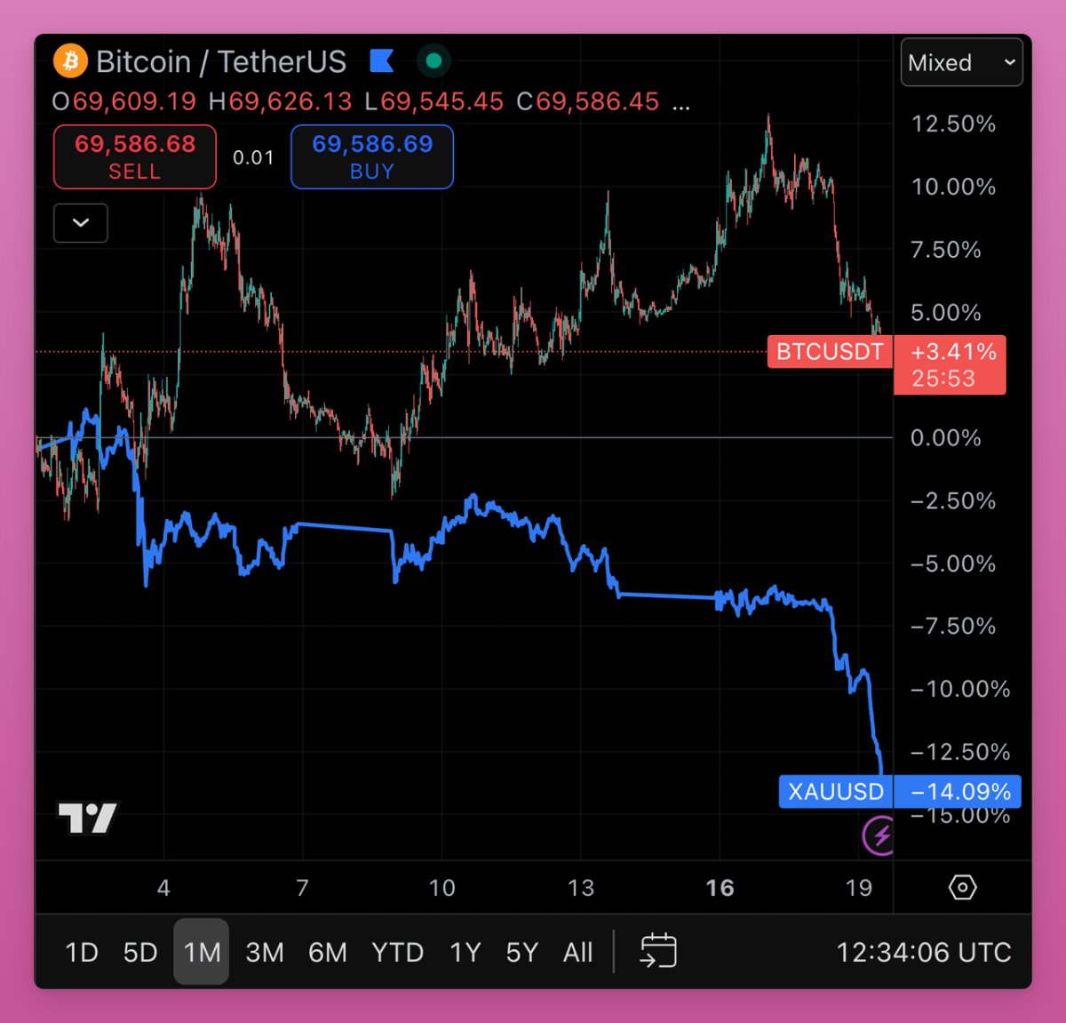 I wished BTC would save face by pumping to catch up with gold. But gold dumping achieves a similar effect.