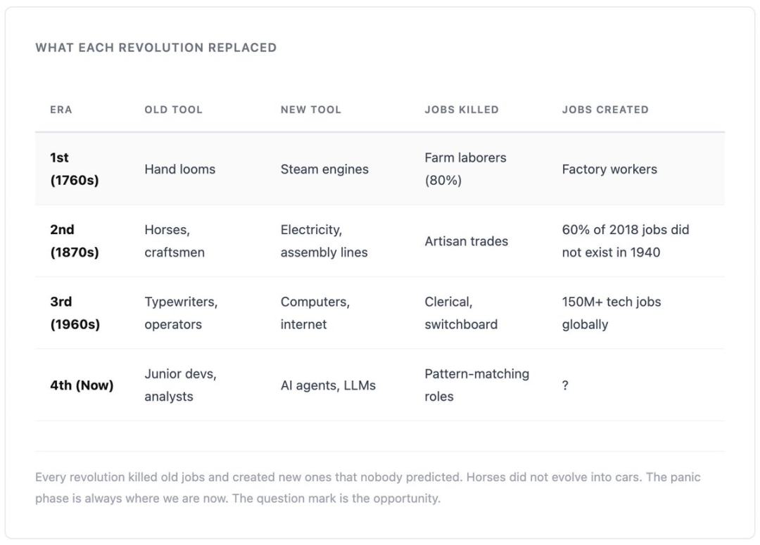 • New tools will create new jobs. In 1995, no one foresaw "social media management"; in 2005, no one foresaw "cloud architect." Today, no one can predict AI-native jobs in 2030. However, with every industrial revolution, the number of jobs created exceeds those destroyed, without exception.