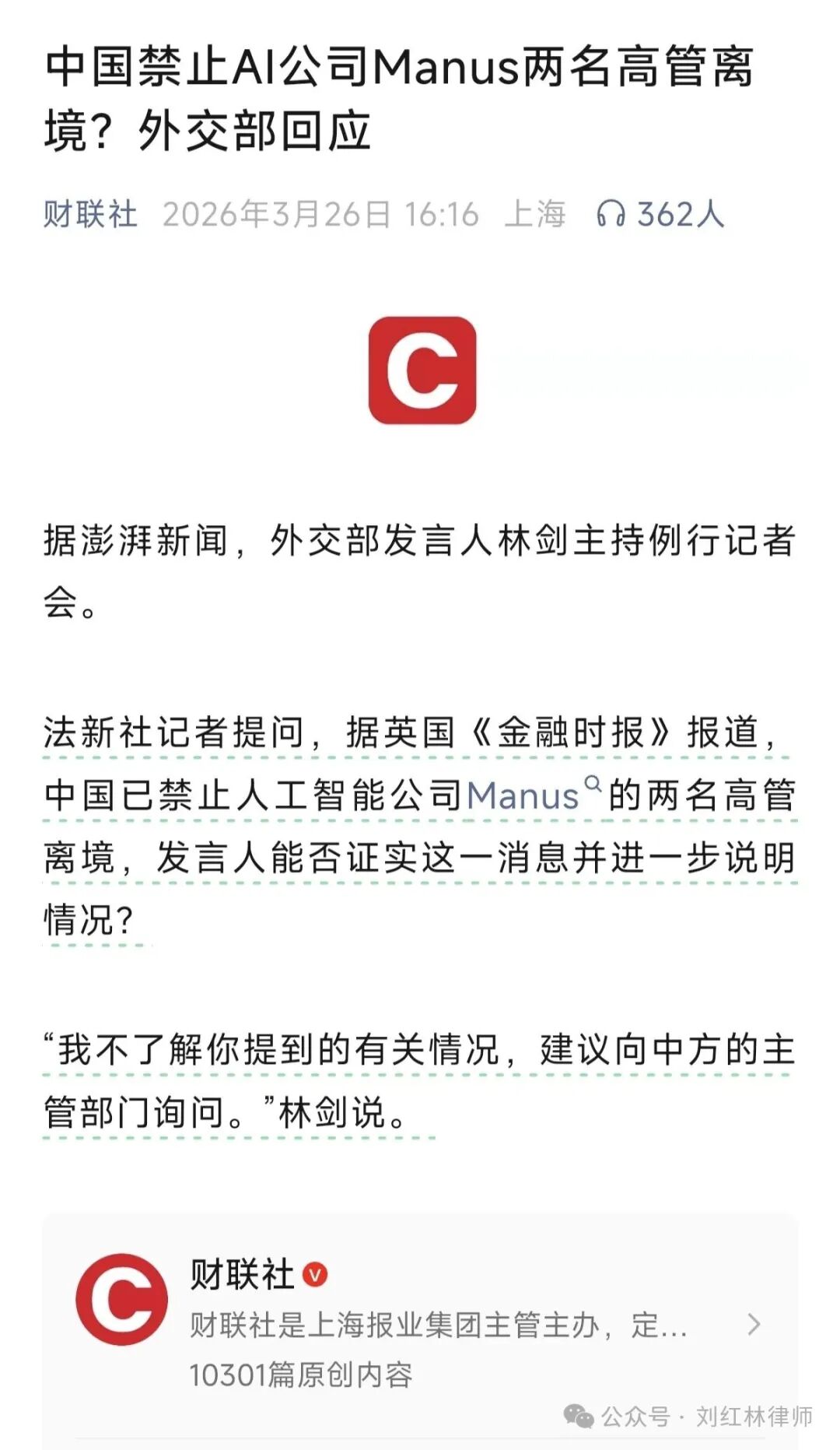 On March 26, Caixin News quoted a report from The Paper stating that at a routine press conference held by the Ministry of Foreign Affairs, in response to the Financial Times report claiming "China has prohibited two executives of the artificial intelligence company Manus from leaving the country," spokesperson Lin Jian replied that he was unaware of the situation and suggested asking the relevant Chinese departments.
