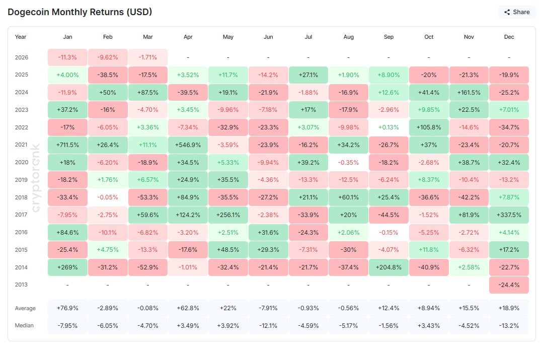 Notably, it suffered losses of 20%, 21.3% and 19.9% in October, November and December 2025, respectively. Investors who anticipated a bullish January 2026 because of Dogecoin’s historical average gain of 76.% were left disappointed as the meme coin plunged by 11.3%.