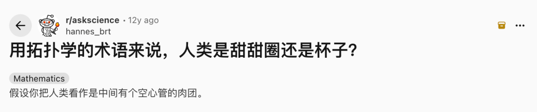The handle of a coffee cup is one hole, and a donut has one hole in the middle, so in topological terms, they are the same shape. Thus, they share the same noble identity—a genus (Genus) of 1 toroidal structure. Following the same logic further, humans and pants do not seem to differ much, as the human body has a continuous digestive tract and two connected nostrils, while pants are conveniently also a two-hole structure.