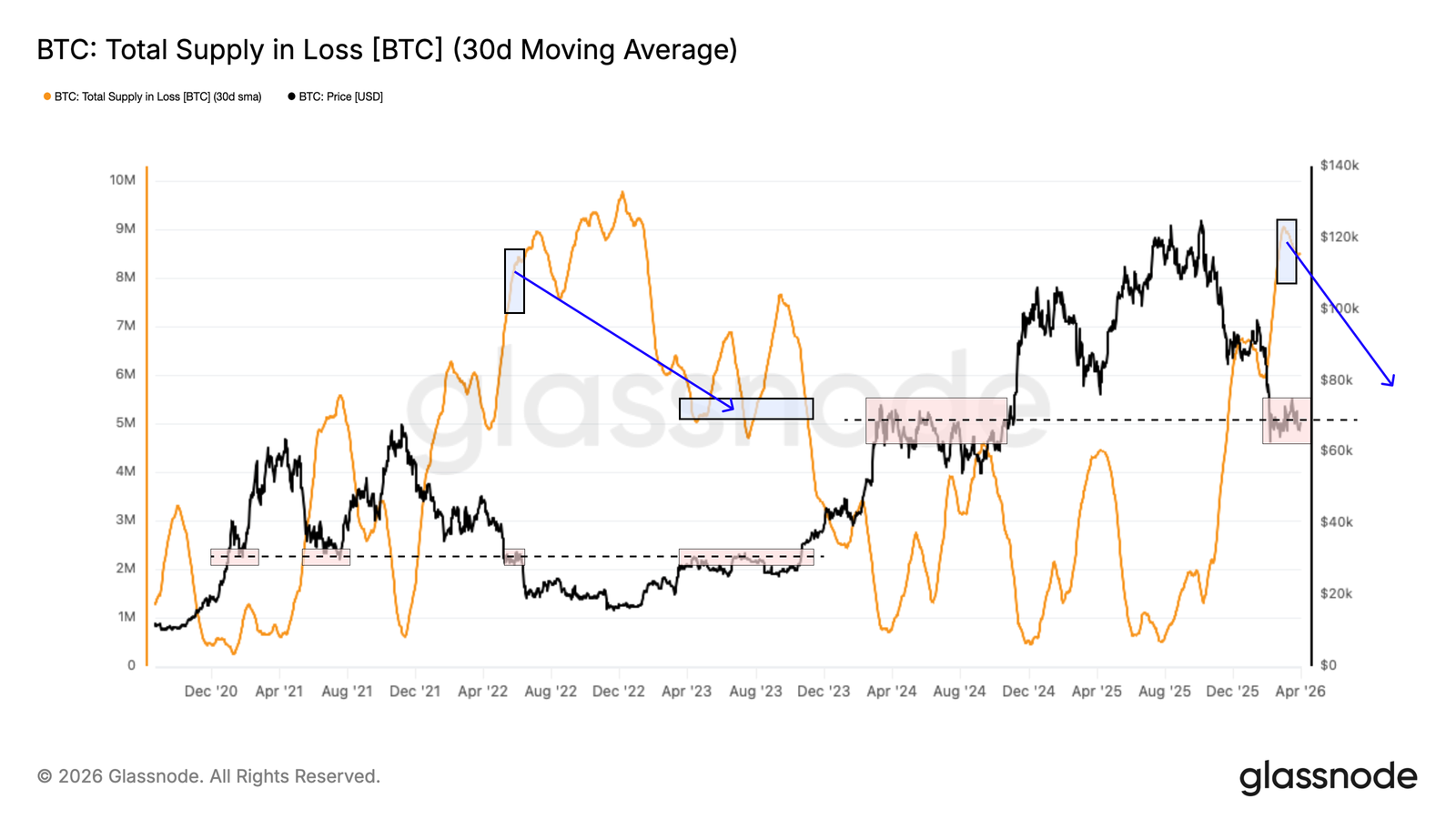 The scale of this value, combined with the spot price trading near the midpoint level of the current cycle, suggests that the market structure resembles that observed in the second quarter of 2022. Historically, resolving such a scale of supply accumulation requires a significant redistribution of coins from loss holders to new buyers entering at lower prices. The precedents set during the 2022 bear market are instructive. Usually, the total supply in a loss state needed to compress from over 8 million BTC to about 5 million BTC before the market decisively regained the midpoint of the cycle. This means that before the market condition normalizes, about 3 million coins changed hands.