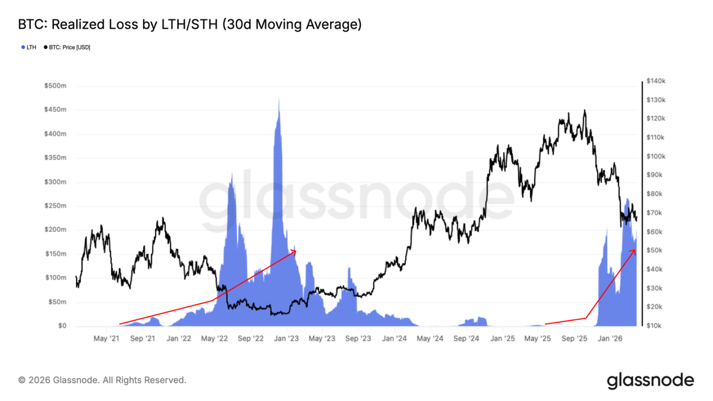The 30-day moving average of this metric has steadily risen since November 2025, currently standing at about 200 million USD per day. This confirms that long-term holders are increasingly surrendering to the current market. While this wave of loss realization is a necessary and constructive step in the bear market clean-up process, it alone is not sufficient to constitute a reversal condition for the market. If this metric can significantly cool down to below 25 million USD per day, it will represent a more convincing signal of seller fatigue and is a prerequisite for market bottoming before the sustainable bull market begins.