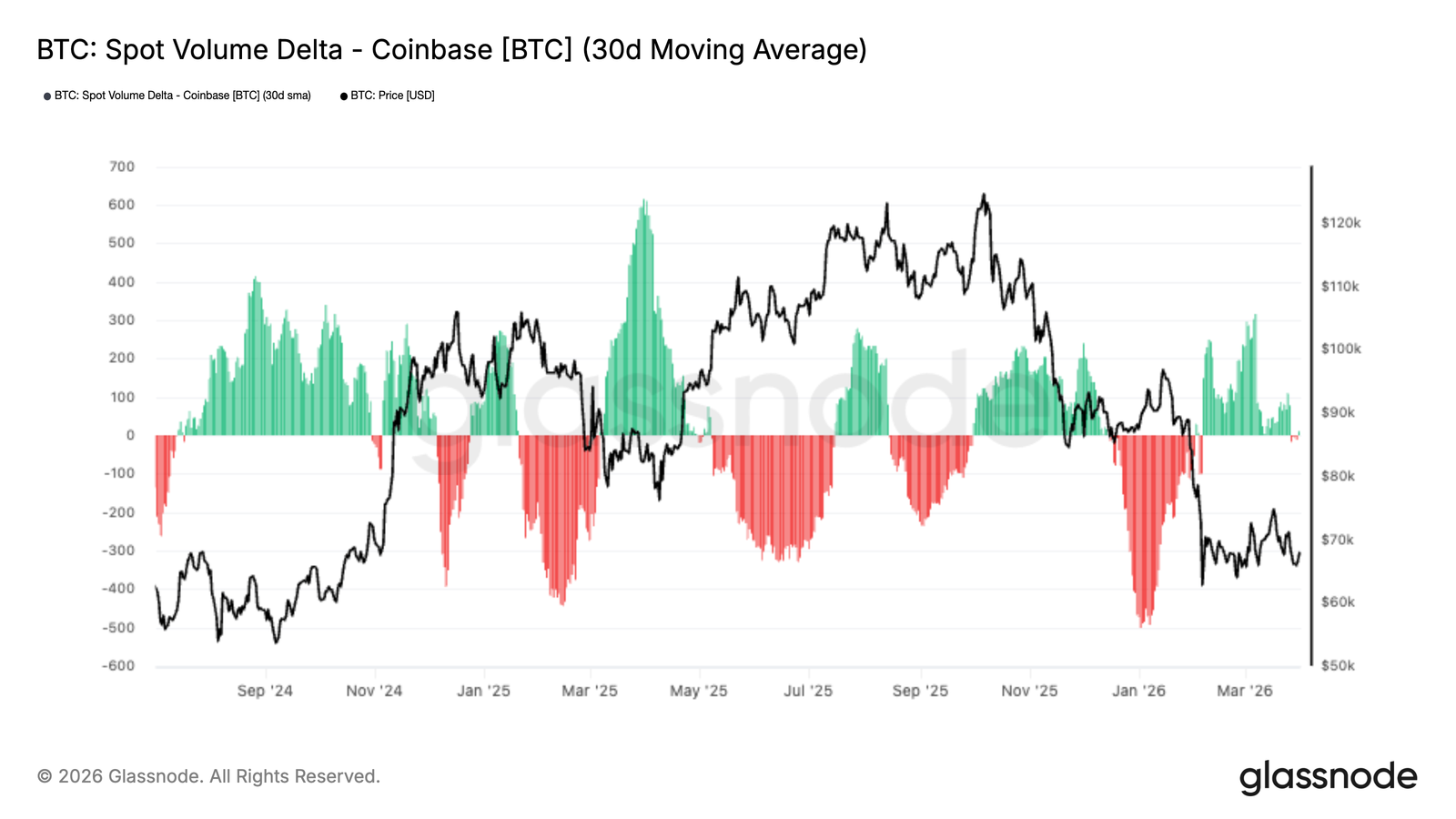 The spot market shows initial signs of stabilization. The 30-day moving average of the transaction volume difference on Coinbase's spot market has turned slightly positive in the latest data. Previously, it experienced prolonged negative values in January and early February, during which the sustained selling pressure reflected ongoing distribution behavior.