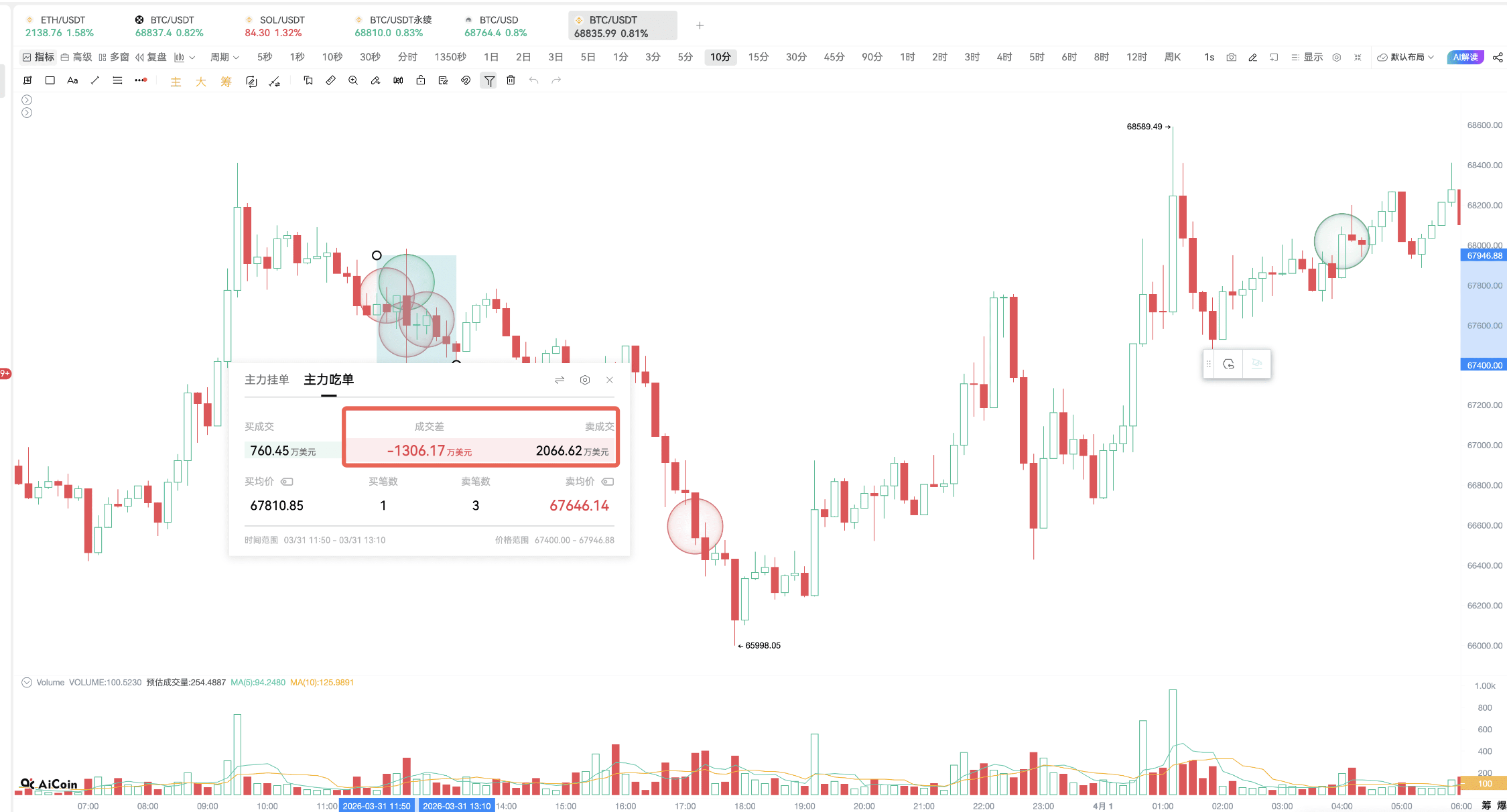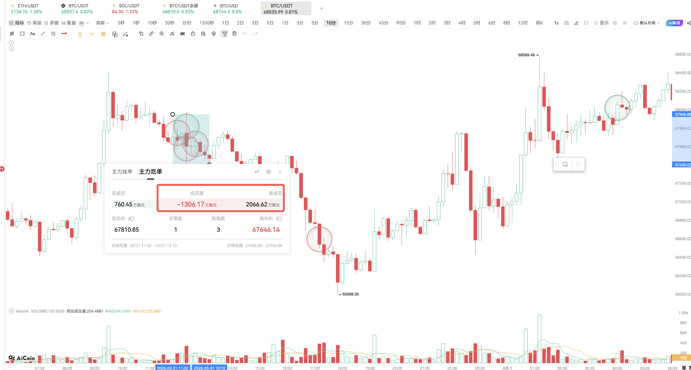 From 12:09 to 12:44 on March 31, in the Binance BTC spot market, the main player executed three market sell orders exceeding 6 million dollars each within just 35 minutes, totaling 20.66 million dollars, with an average selling price of 67,646 dollars.